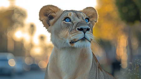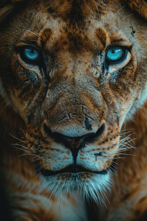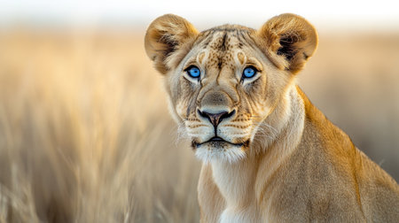 Close-up photo of a blue eyed lioness. The enchanting blue eyes of this lioness reflect the vibrant beauty of her surroundings, a true queen of the savanna.