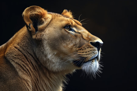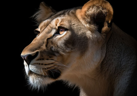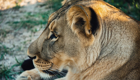 A detailed profile shot of a lioness, showcasing her powerful features and calm demeanor.