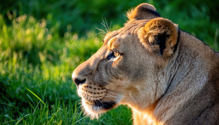 Close-up profile of a lioness bathed in warm golden hour light, with a soft focus on the vibrant green grass in the background.