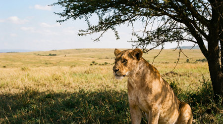 A lioness finds shade under an acacia tree in the vast African savannah, gazing out at the dry grasslands.