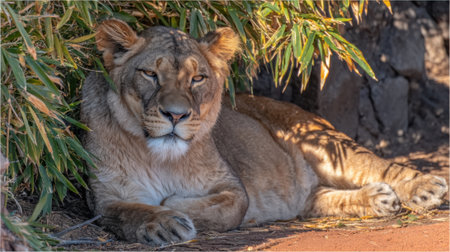 A beautiful lioness is captured resting in the shade of dense green plants, looking calmly towards the camera.