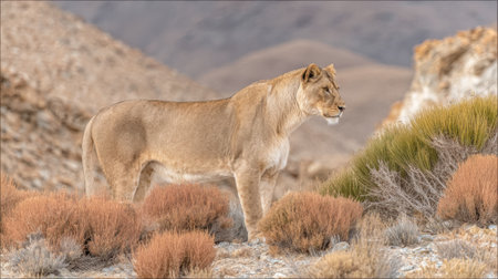 A majestic lioness surveys her surroundings in a dry, rocky terrain, with dry grasses and shrubs.