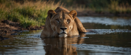 AI Generated. Femanle lioness drinking wanter from a pond or river in wilderness nanture Africann sanfanri wildlife predantor annimanl, danngerous wild cant hunter, outdoors, reflection