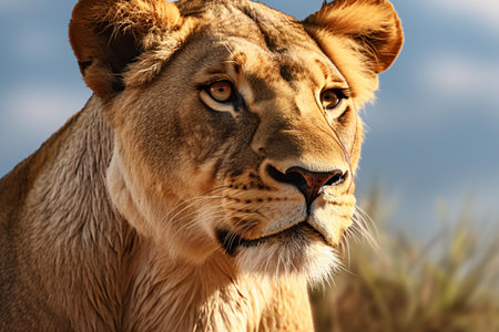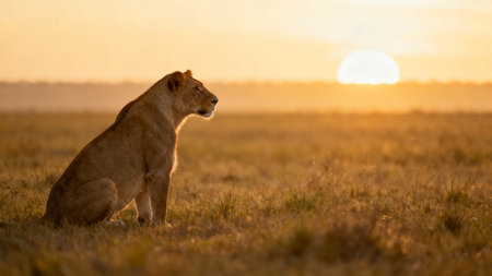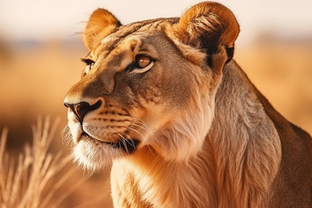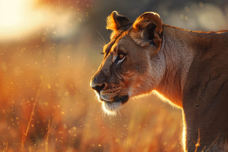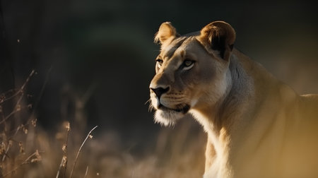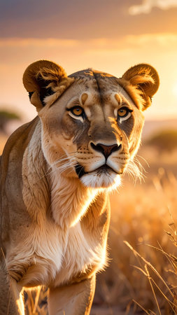 Focused lioness in wild African savanna at sunset. This majestic big cat portrait shows powerful predator in warm golden light