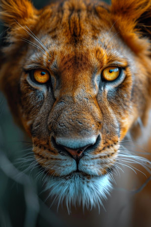 Close-up portrait of powerful male lion with intense gaze in natural habitat
