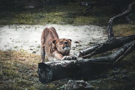 A lioness lies comfortably on a smooth ledge, basking in the serene afternoon light. Her calm demeanor and relaxed posture create a peaceful atmosphere in the enclosure.