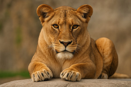 AI generated ultra realistic lioness resting calmly on a rock with focused eyes warm natural tones serene strength and wildlife elegance