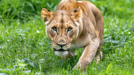 A striking lioness confidently walks through lush green grass, showcasing its power and grace in a natural habitat. Perfect for wildlife enthusiasts.