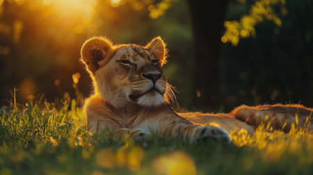 A young lion cub lies comfortably on green grass, soaking in the intense sunlight. The golden hue of the sunset creates a serene atmosphere, enhancing the peaceful moment.