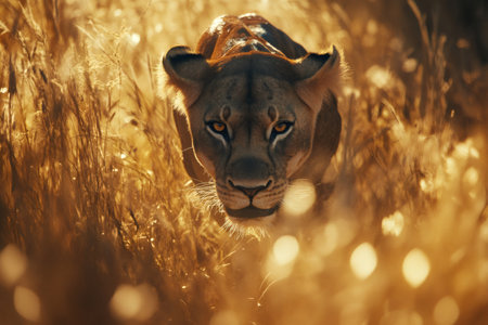 Lioness stealthily stalks its prey through tall grass bathed in the warm, golden light of the setting sun