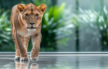 This captivating image showcases a lioness gazing thoughtfully at her reflection in a rustic mirror, capturing the beauty and majesty of wildlife in a serene moment.