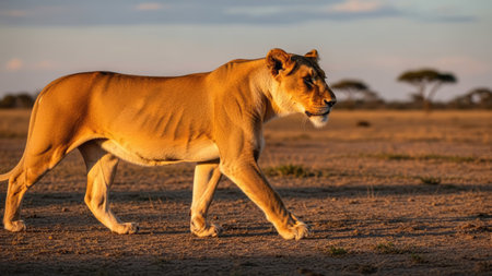 A lioness strides across a dry, open landscape under a warm sunset. The image displays natural colors, featuring golden light and a low-angle perspective. The scene suggests an outdoor environment, possibly a savanna. Suitable for editorial and commercial use.