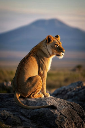 Lioness sitting on a rock in front of Mt Kilimanjaro, Tanzania