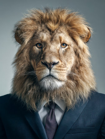 A striking visual representation featuring a businessman with a lion head, merging elegance with wild majesty. This artwork symbolizes strength and leadership in a unique and imaginative way.