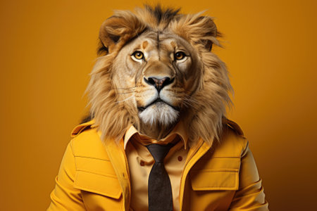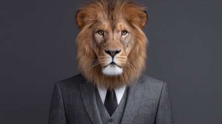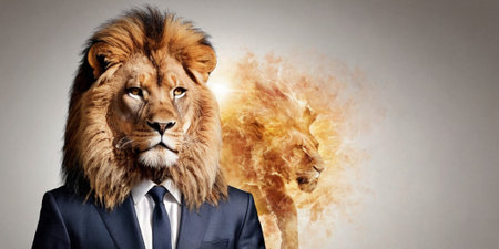 A striking visual representation featuring a businessman with a lion head, merging elegance with wild majesty. This artwork symbolizes strength and leadership in a unique and imaginative way.