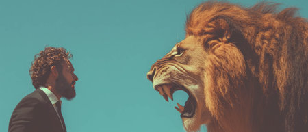 Businessman shares a humorous moment with a powerful lion in a creative collage