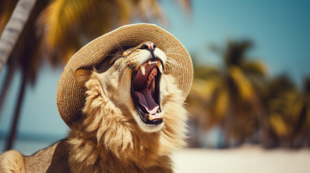 Lazy lion wearing a hat resting on the beach. High quality photo