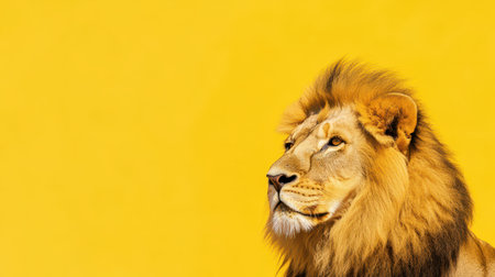 A proud lion with a full mane stands alert featuring a vibrant yellow background that enhances its majestic presence and regal features.