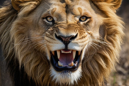 Portrait of a male lion with open mouth and sharp teeth.