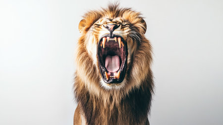 A lion mid-roar on a white background, mouth wide open, and teeth bared, capturing the raw power and intensity of the king of the jungle.