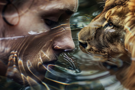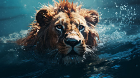 a stunning water lion animal wallpaper captured in hyper-realistic portraiture style using the canon eos 5d mark iv. this mesmerizing image, rendered in 8k resolution with the unreal engine 5, showcases the symbolic storytelling elements reminiscent of album covers. the cross-processed film effect adds a unique touch to this visually captivating masterpiece. ai generated