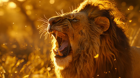 Powerful male lion roaring with mouth wide open, displaying sharp teeth and impressive mane against a blurred golden sunset, capturing the wild spirit of the african savanna