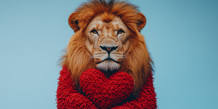 A lion wears a cozy red outfit shaped like a heart to celebrate Valentine's Day with love.