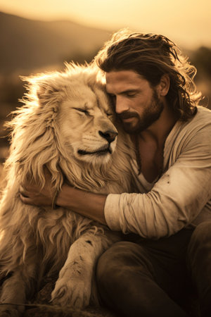 A serene moment unfolds as Jesus gently connects with a lion amidst a hazy atmosphere. The golden hour bathes the scene in warm light, creating a dreamlike ambiance.