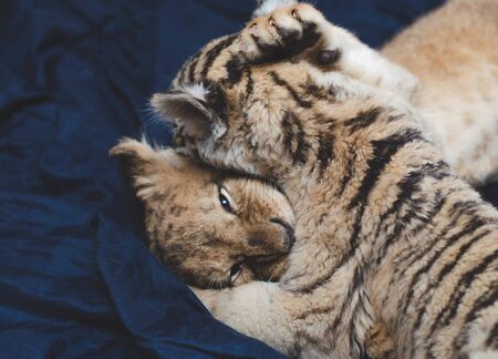 Photo of a game of a lion cub and a tiger cub on a blue background.