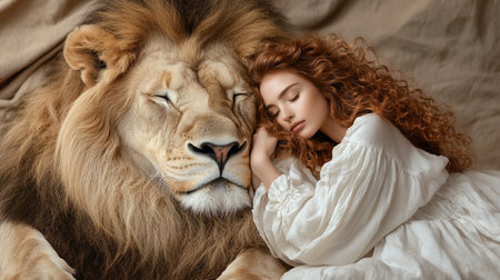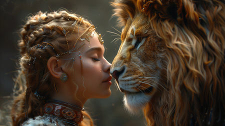 girl with a lion nearby .Generative AI