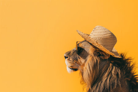 Lion in hat and sunglasses on orange background symbolizes safari tours, copy space.