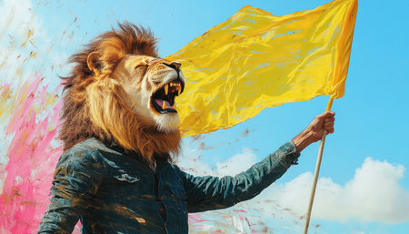 Man wearing a lion mask is roaring and waving a yellow flag in a paint splattered environment