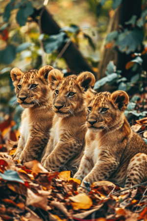 proud lion stands guard alongside two playful cubs shadowy forest. Together they radiate strength and family bonds dusk backdrop.