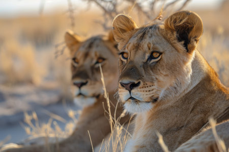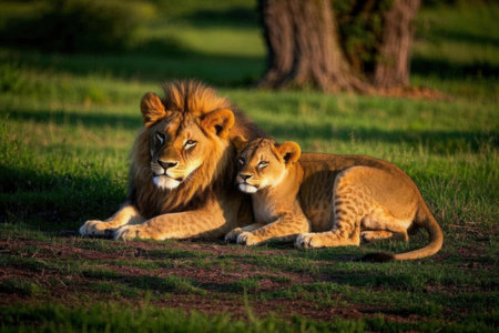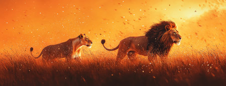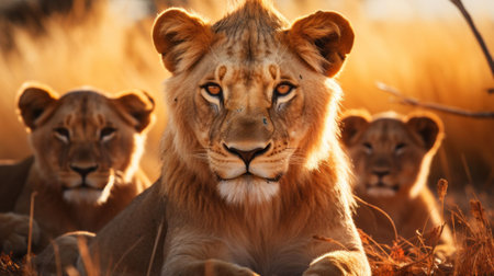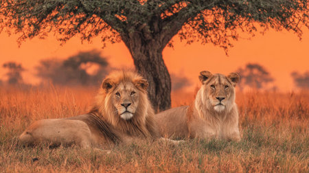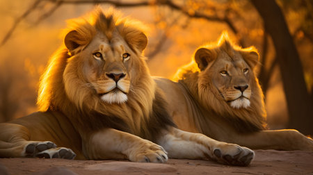 Noble African lions basking in the warm golden glow of a breathtaking sunset on the savanna
