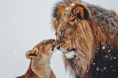 Majestic male lion and lion cub portrait with space for text, object on right side