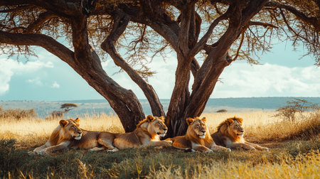 Lion family resting under a tree in Serengeti National Park, Tanzania