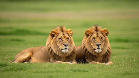 Two lions are standing next to each other, looking at the camera. The scene is peaceful and serene, with the lions appearing to be content and relaxed