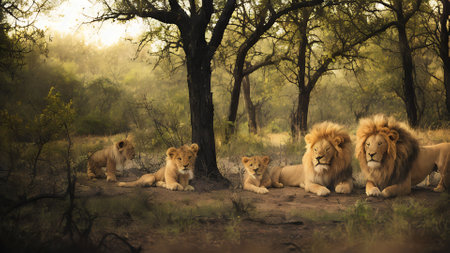 pride of lions resting, relaxed lions, lion family with cubs relaxing.