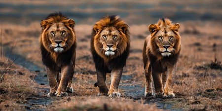 Three magnificent lions roam the savannah in search of prey as a group. Concept Wildlife Photography, African Safari, Lion Hunting Behavior, Predator Prey Interaction, Savannah Ecosystem