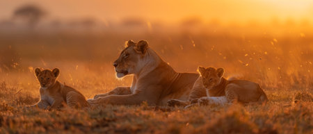 A heartwarming scene unfolds as a lioness cuddles with her young cubs in the soft light of sunrise, amidst the wild beauty of the savanna
