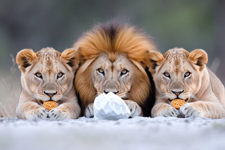 A lion and two lionesses rest on the ground, each with a cookie, creating a playful scene in nature.