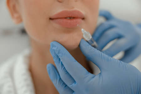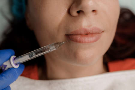 Young caucasian woman getting botox cosmetic injection in the lips. Beautiful woman gets botox injection in her face. Adult girl gets cosmetic injection of botox in a clinic. Beauty treatments