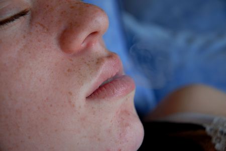 Young woman with freckles summer style standing isolated on blue background breathing lips close-up