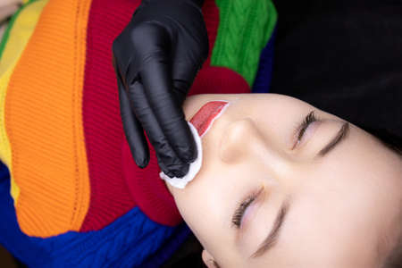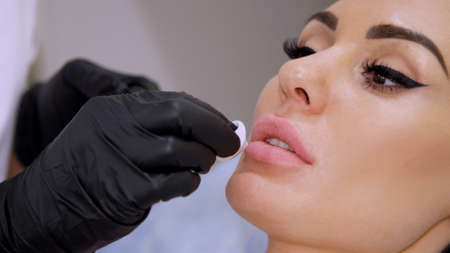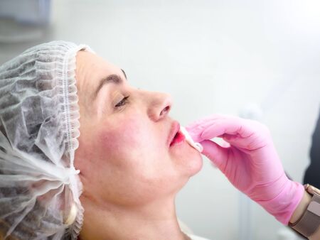 close-up, cosmetology room in the clinic, the doctor wipes patient lips with a sterile napkin, before injections of hyaluronic acid into lips, cleans the surface with an antiseptic. High quality photo