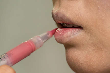 Lips augmentation. Syringe female mouth. Hyaluronic acid injection. Age changes. Cosmetology Treatment.