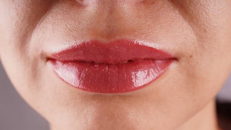 Macro photo of process of applying permanent makeup tattoo of red on lips woman