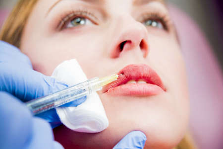 Lip Augmentation and Correction form. Cosmetology Treatment. Pretty young blond woman getting beauty injection for lips. Close up of hands of cosmetologist making injection in female lips