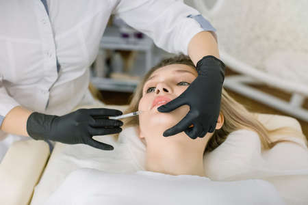 The doctor cosmetologist makes Lip augmentation procedure of a beautiful woman in a beauty salon. Cosmetology skin care. High quality photo