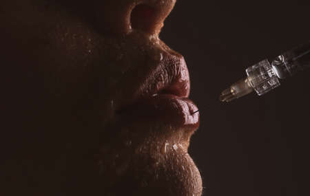 young woman holding with hand syringe with liquid drop near sexy lips and mouth on grey background