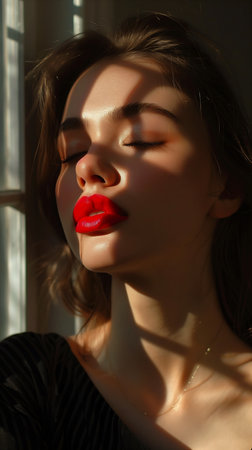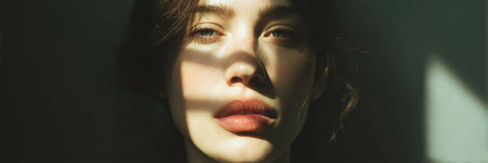 A captivating close-up of a woman's face, beautifully illuminated by natural light and soft shadows, showcasing the elegance of her smooth skin and glossy lips.
